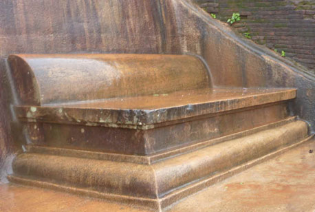 To the north just above the pond is a throne carved out of the surrounding rock. The seat faces east and aligns with the central east-west axis of the complex. It provided an uncluttered vista to the horizon. The post holes on the floor clearly indicate that a four-posted canopy was erected to provide shade and protection. A grooved channel was carved behind the seat to prevent water from draining down into it. Seated or reclining on this, King Kasyapa spent the evening watching recitals of poetry and productions of Sinhala theatre. It is said that some of the very first Sinhala plays were performed here during Kasyapa's reign.